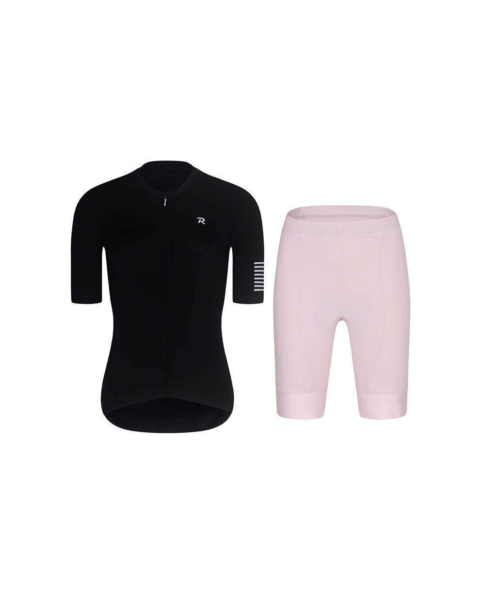 The Rivanelle women’s cycling set is the ideal choice for cyclists looking for a combination of style, comfort and functionality. The combination of the VICTORIOUS LADY short-sleeved jersey in black and the DYNAMIC ELITE short cycling shorts without braces in pink creates an attractive outfit that will stand out on every ride.
