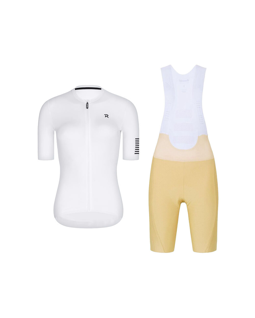 The Rivanelle VICTORIOUS LADY / NOVEL PRO women’s cycling kit is the ideal choice for female cyclists seeking a combination of style, comfort and high performance. The combination of an elegant white short-sleeved jersey and premium beige bib shorts creates a harmonious outfit suitable for training, long rides and sporting challenges.